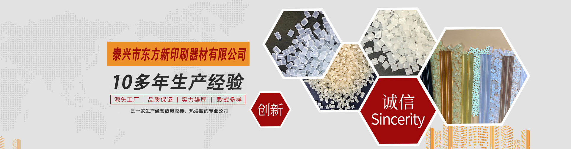 泰興市東方新印刷器材有限公司是專一生產(chǎn)綠色環(huán)保型印刷裝訂書刊熱熔膠,封箱包裝熱熔膠,吸管膠,鞋材熱熔膠,冰箱熱熔膠,熱熔膠棒,地毯背膠等。產(chǎn)品具有快速粘接、耐老化、強(qiáng)度高、熱穩(wěn)定性好、無(wú)毒害等優(yōu)點(diǎn),廣泛用于無(wú)線膠訂、自動(dòng)化封箱,飲料吸管粘結(jié)接,電子電器、工藝品、玩具、家具等領(lǐng)域,公司與多家科研機(jī)構(gòu)建立了緊密的戰(zhàn)略合作關(guān)系,質(zhì)量達(dá)到先進(jìn)水平,產(chǎn)品已銷往全國(guó)30多個(gè)省市地區(qū),并出品到東南亞多個(gè)國(guó)家和地區(qū)。    公司堅(jiān)持“誠(chéng)信為本,貼心服務(wù)”為廣大顧客提供優(yōu)質(zhì)產(chǎn)品,董事長(zhǎng)兼總經(jīng)理黃衛(wèi)東先生攜全體員工,竭誠(chéng)歡迎各界朋友光臨指導(dǎo)、洽談合作、共贏同發(fā)展。    Taixing Dongfang New Printing Equipment Co., Ltd. specializes in the production of green and environmentall…